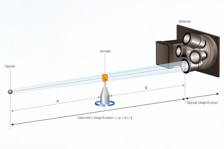 与传统microCT相同,图像首先通过几何投影放大,随后投射到闪烁体上,将X射线转换为可见光图像,然后通过显微镜光学元件进行光学放大,最后由CCD探测器采集图像。